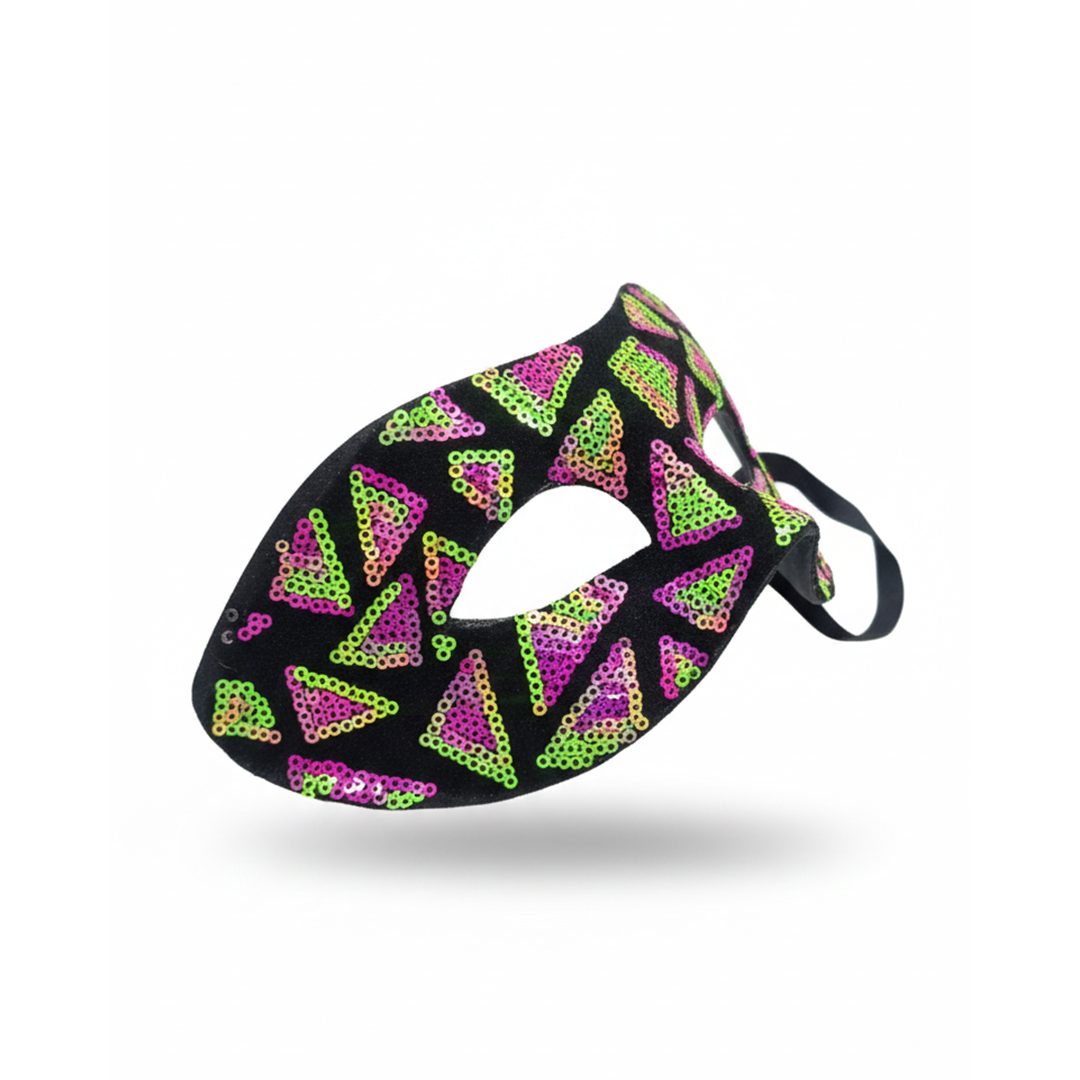 Gracias a su estilo vibrante, este antifaz destaca especialmente bajo luz UV o iluminación negra, siendo una opción infaltable para glow party y fiestas flúo.