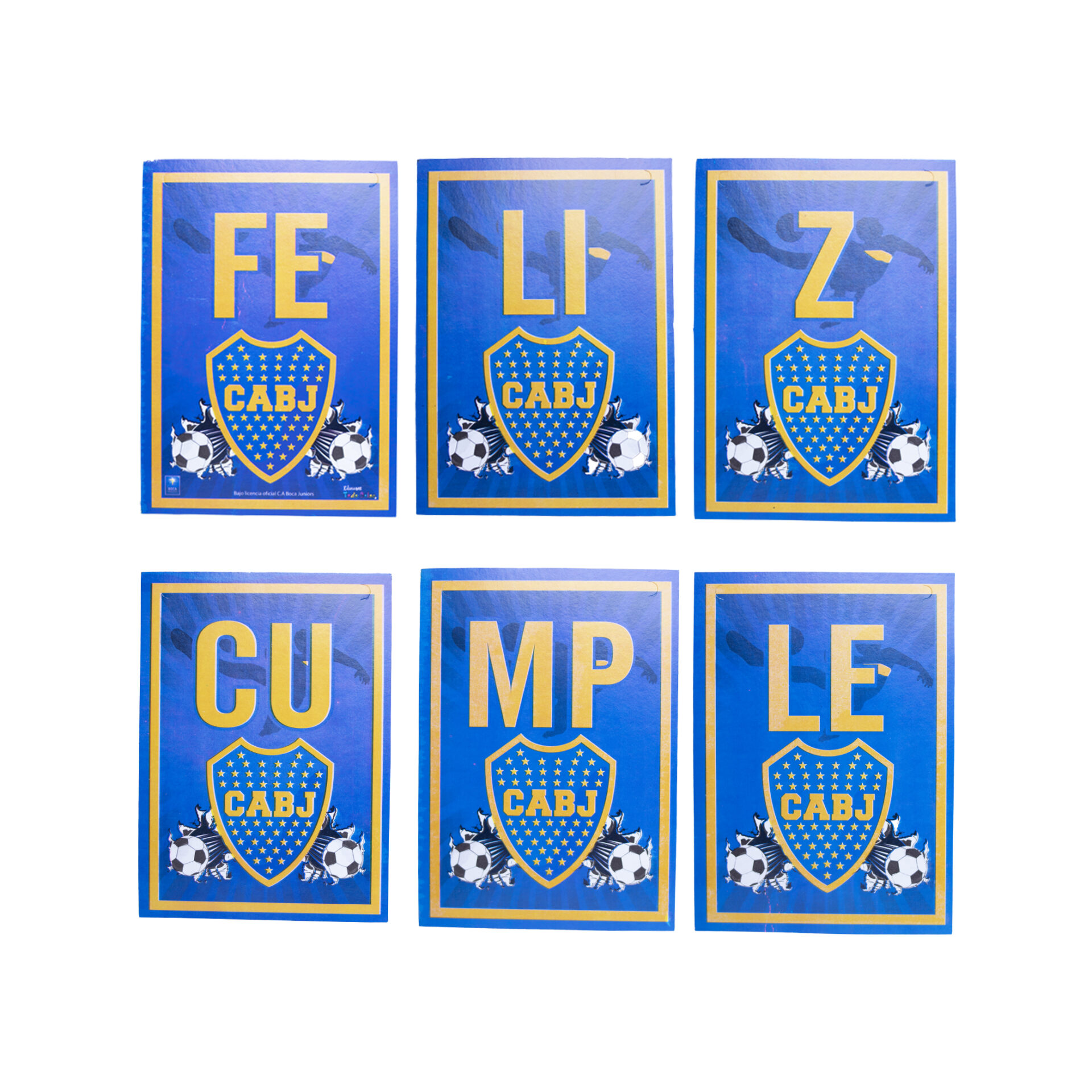 Es un banderín decorativo de cartón o plástico liviano con los colores, el escudo y la tipografía representativa de Boca Juniors, que forma la frase “FELIZ CUMPLE”. Se presenta en formato de guirnalda para colgar fácilmente, y es ideal para decorar paredes, mesas de dulces o entradas de cumpleaños.