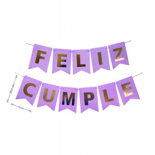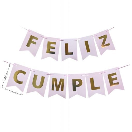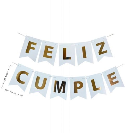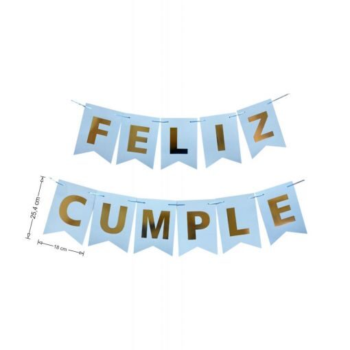 - Frase «FELIZ CUMPLE» con letras estampadas doradas.