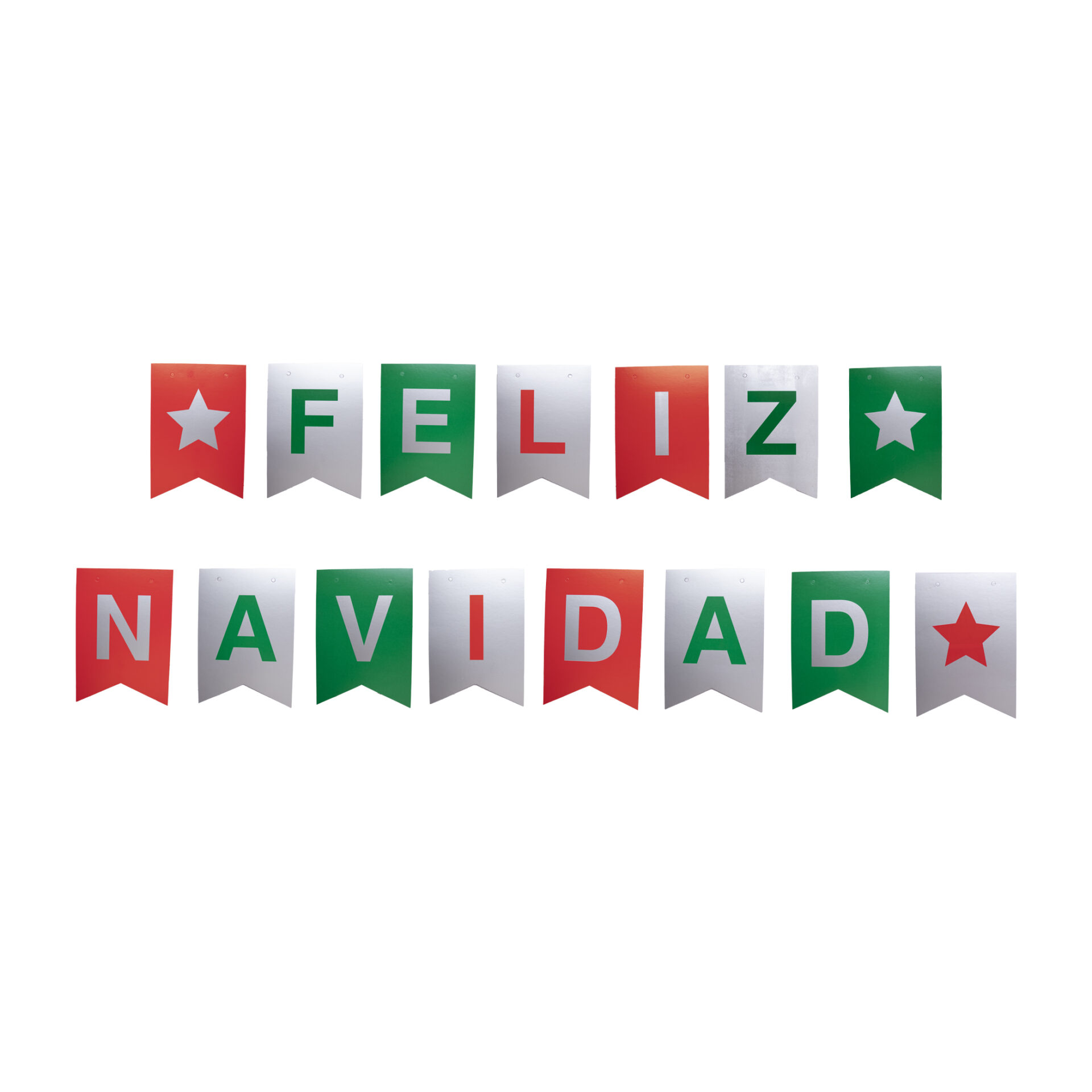 El paquete contiene un banderín multicolor con la frase «feliz navidad» y una cinta plateada para unir las partes.
