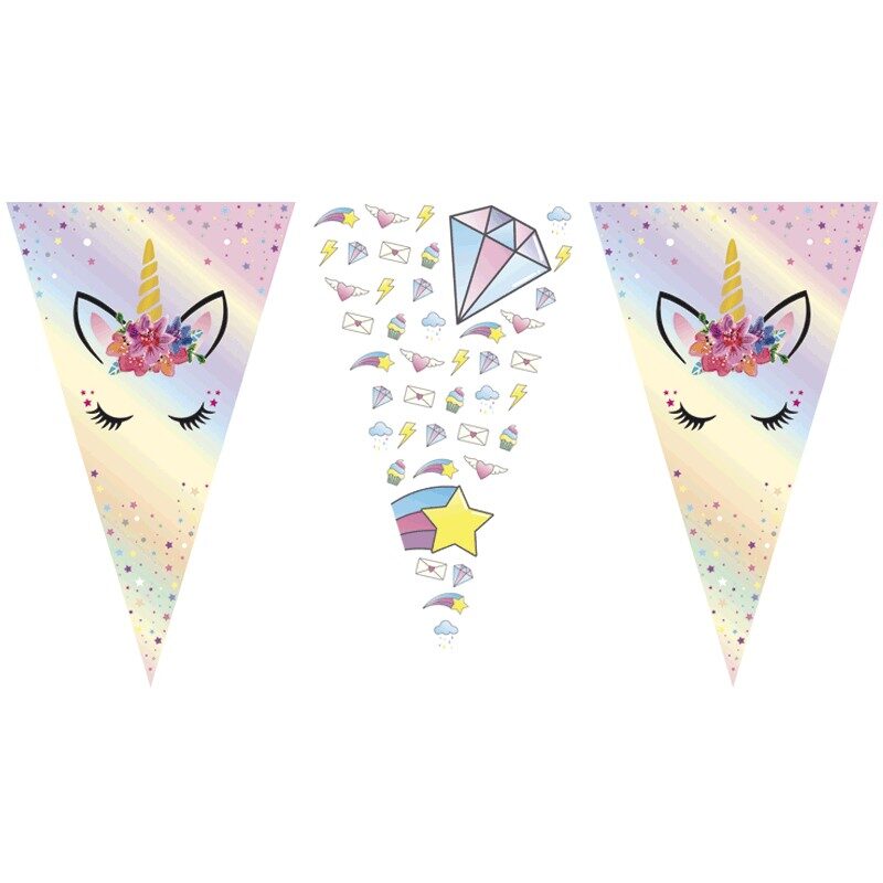 Es una guirnalda decorativa compuesta por triángulos de cartón o papel ilustrado con un adorable diseño de unicornio y colores pasteles. Está pensado especialmente para decorar fiestas temáticas de unicornios, cumpleaños mágicos o celebraciones llenas de fantasía.