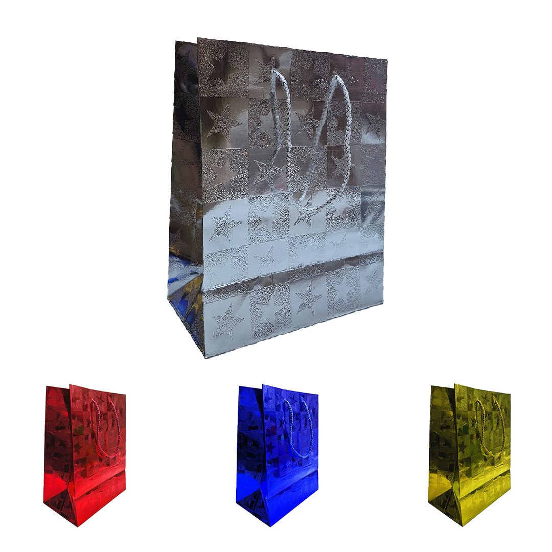 - Bolsa de cartulina con terminación metalizada y diseño de estrellas.