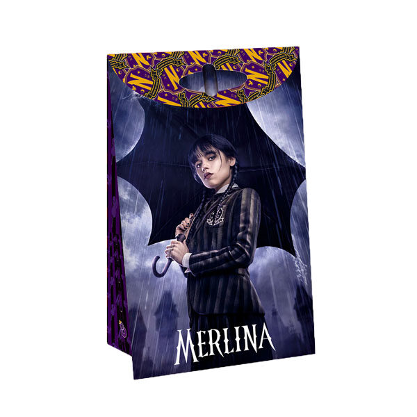 Son bolsitas rectangulares de cartón con base plegable, de apertura superior, que vienen en packs de 8 unidades. Su diseño está inspirado en el personaje de Merlina Addams y su estética oscura pero encantadora: tonos negros, violetas, grises y elementos como telarañas, calaveras, cruces o retratos góticos. De de 17 cm de alto x 10,5 cm.