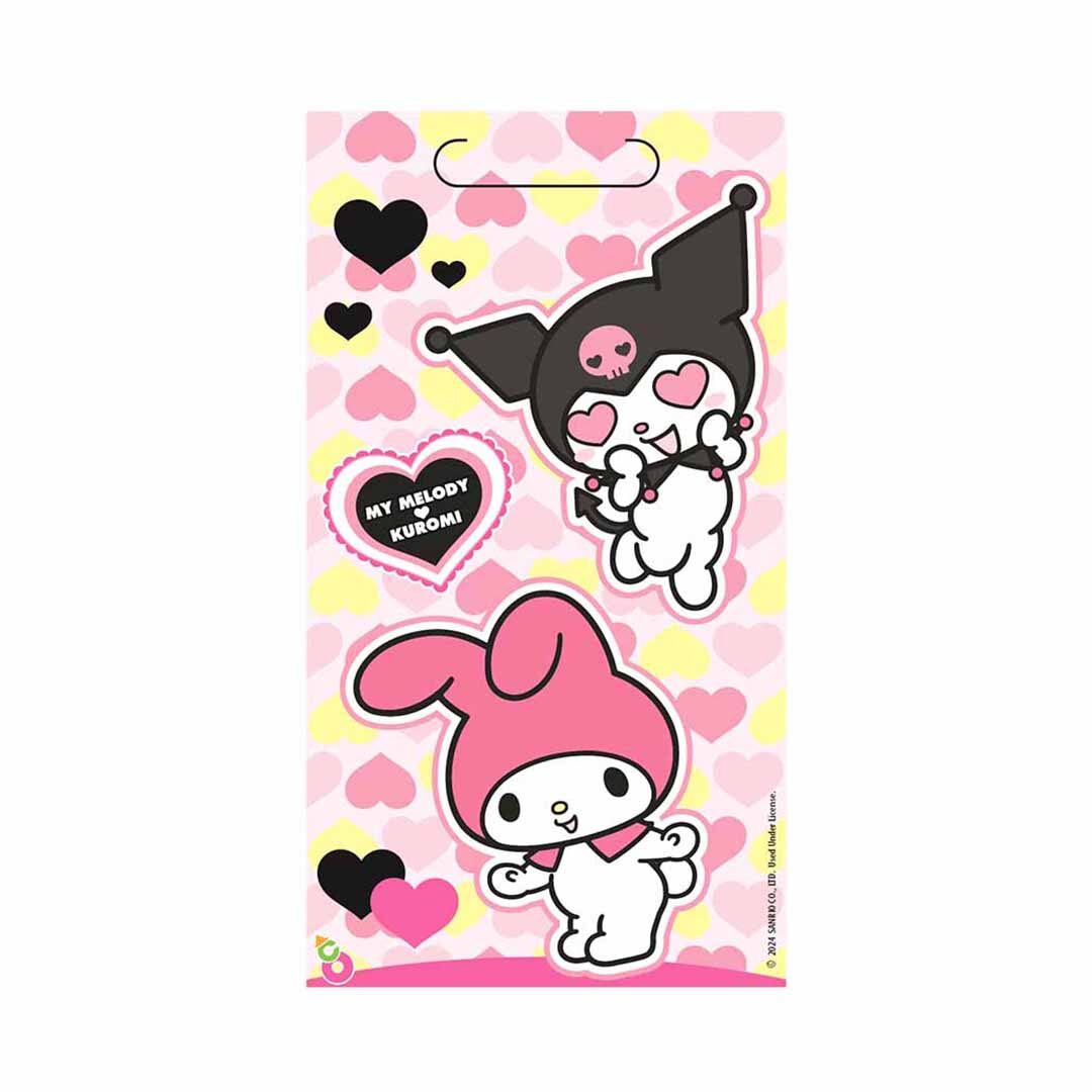 Sorprende a tus invitados con las encantadoras Bolsitas Sorpresa de My Melody & Kuromi. Este set incluye 10 bolsitas decoradas con los adorables personajes de Sanrio, perfectas para llenar con dulces, juguetes o pequeños regalos en fiestas y celebraciones.