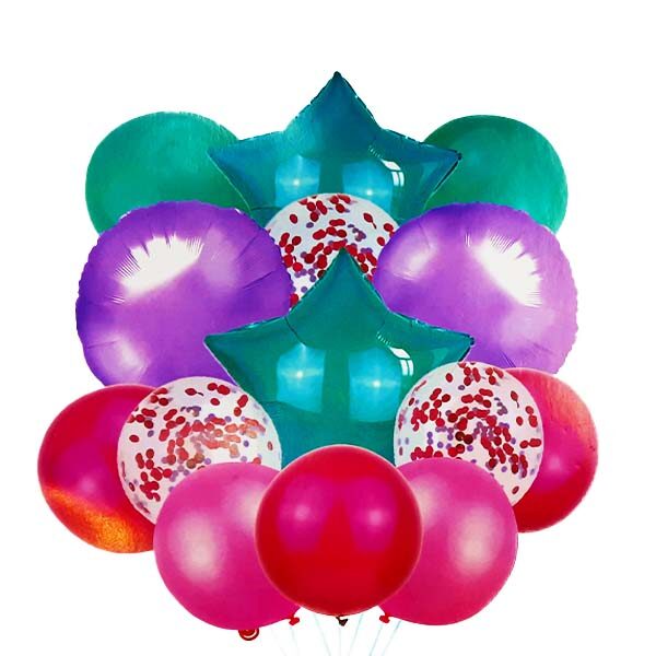 - 14 globos incluidos: Mezcla equilibrada de tonos lila, fucsia y verde marino, con acabados metalizados y látex.