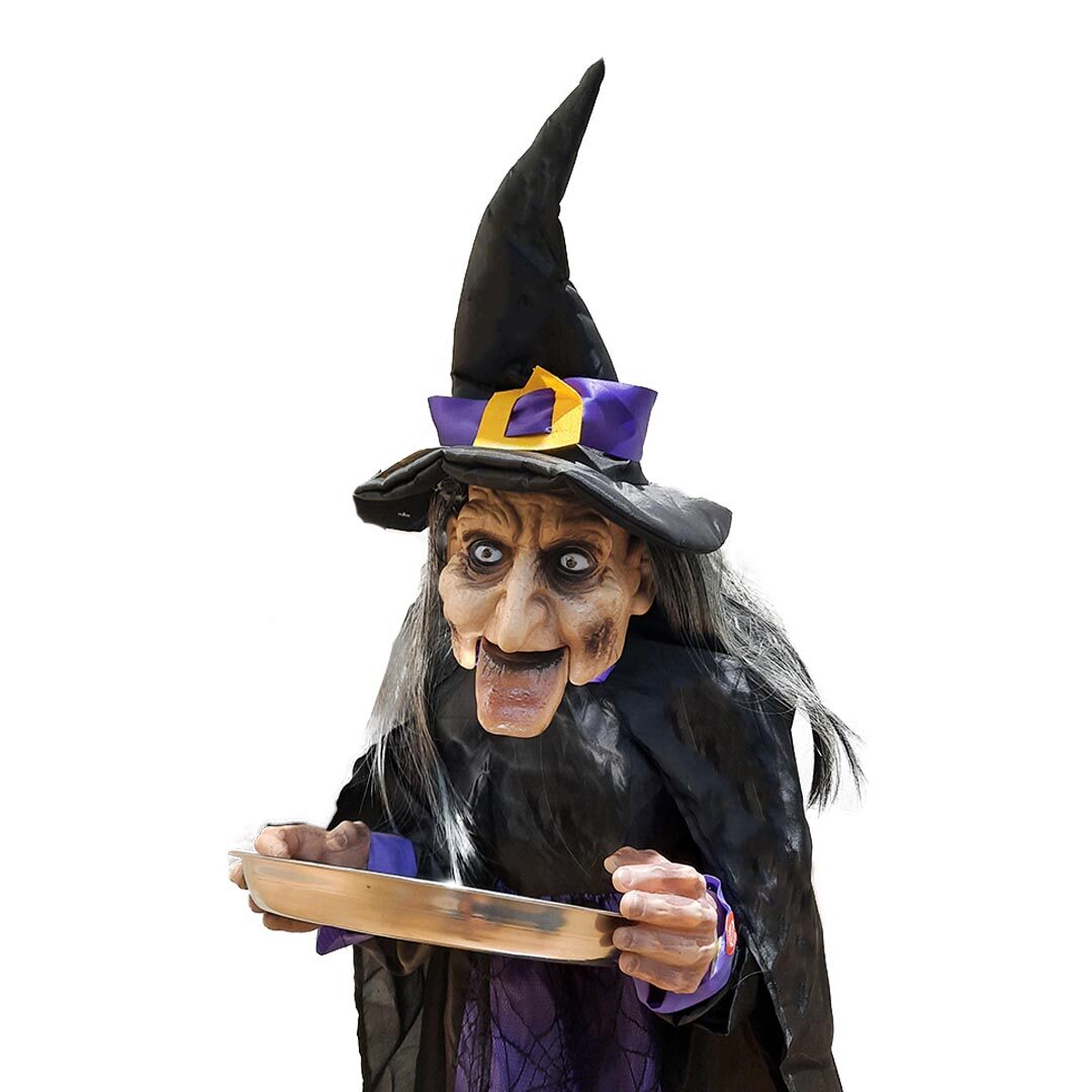Esta Bruja de 1 metro con LED, sonido y bandeja golosinera es el accesorio perfecto para darle un toque espeluznante y divertido a tu fiesta de Halloween. Coloca caramelos o dulces en la bandeja que sostiene esta figura aterradora mientras asusta a tus invitados con sus ojos de luz LED roja y sonidos de gritos espeluznantes.
