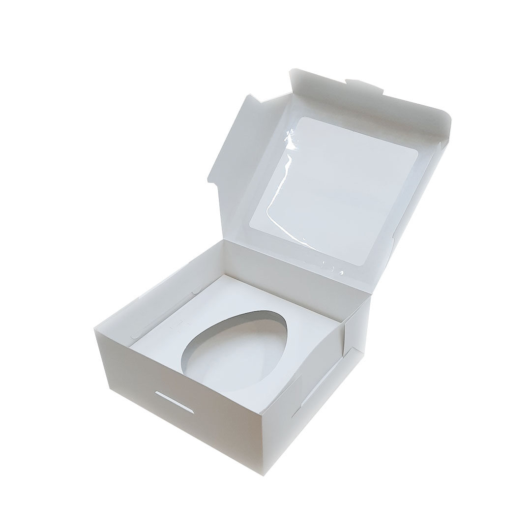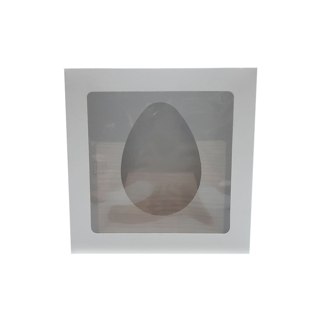 Fabricada en cartulina de calidad con ventana transparente, permite que el huevo se vea sin necesidad de abrir la caja. El tamaño es ideal para piezas de chocolate medianas con relleno, y su formato hace que sea fácil de armar y cerrar de forma segura.