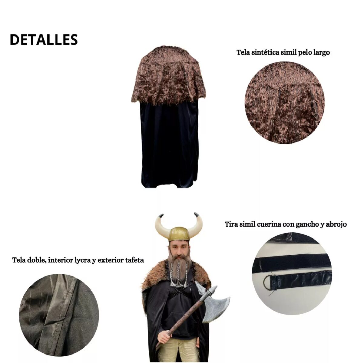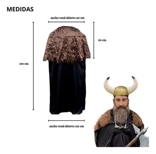 Esta capa vikinga inspirada en la mitología nórdica es el accesorio ideal para complementar cualquier disfraz de guerrero o aventurero del estilo Ragnarok. Perfecta para eventos temáticos, fiestas de disfraces o cosplay, esta capa te transportará a la era de los vikingos con su diseño robusto y elegante.