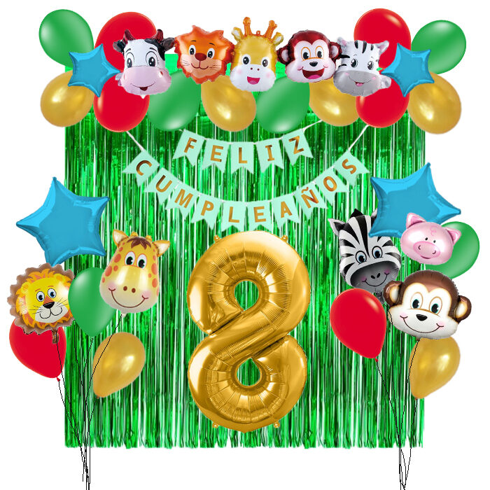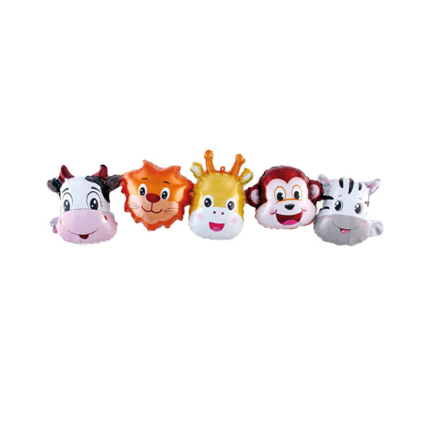 - 5 globos metalizados de animales de 30 cm: chancho, jirafa, mono, león, cebra.
