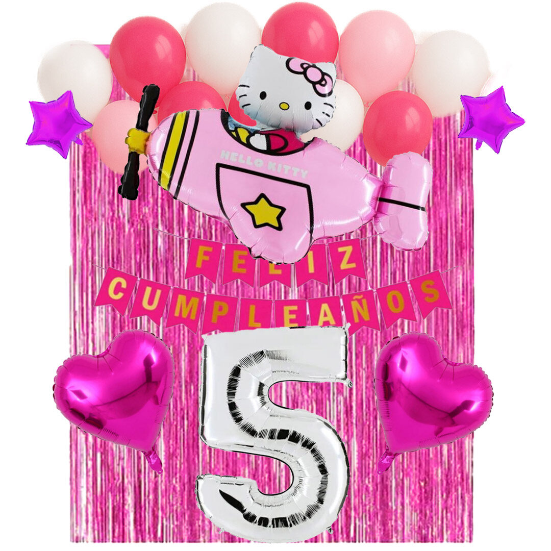 Los colores base son los clásicos de Hello Kitty (rosa, blanco, rojo), pero podés complementarlo con globos o accesorios de otros tonos por aparte del combo.