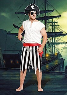 Estilo: Disfraz de pirata; incluye remera blanca, cinto rojo y pantalón rayado, gorro pirata y parche para el ojo.