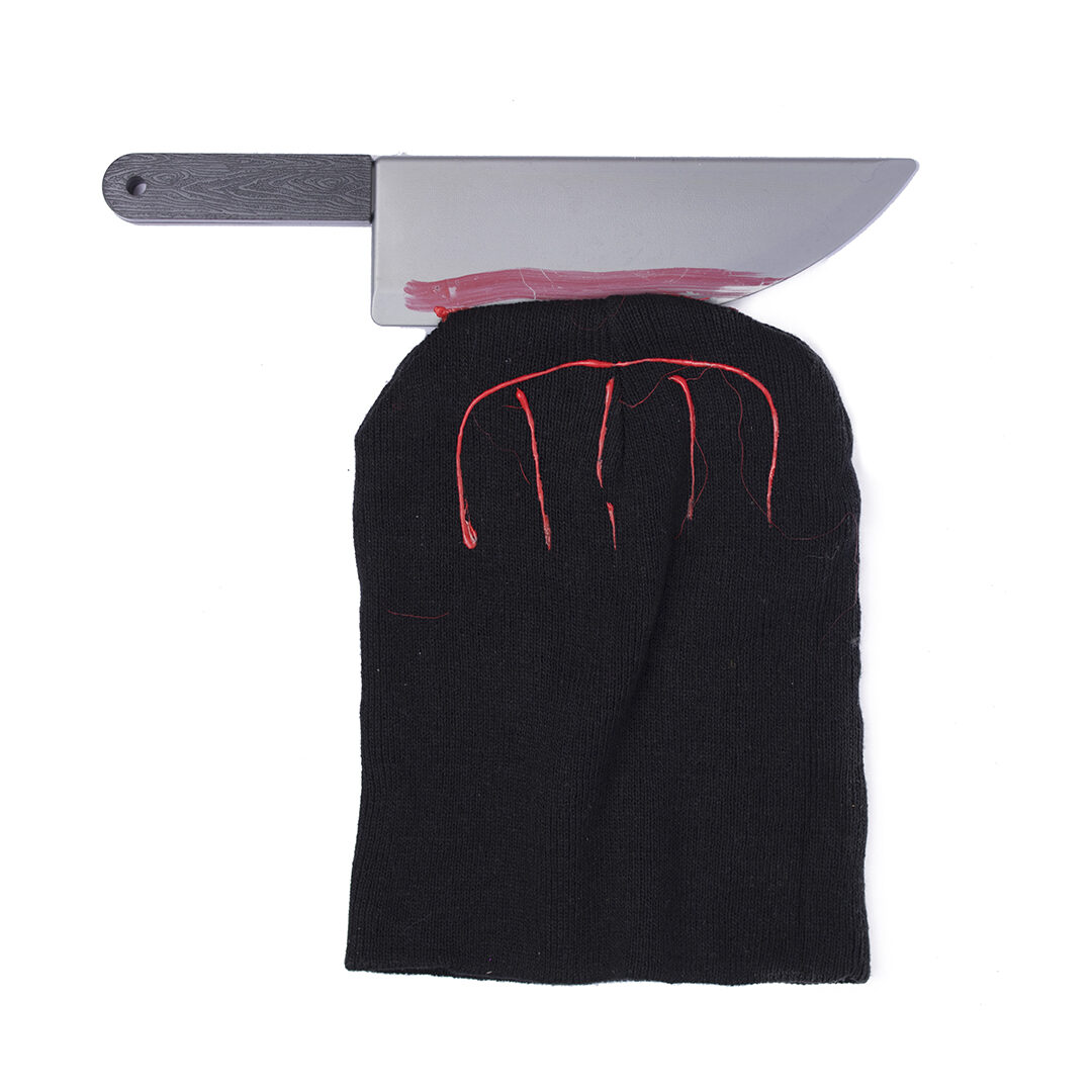 Sumérgete en el mundo del terror con nuestro gorro de asesino de alta calidad. El cuchillo clavado y el efecto de sangre realista te harán sentir como un verdadero psicópata. Perfecto para completar tu disfraz de Halloween.