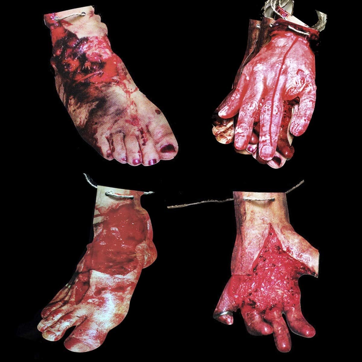Es una guirnalda decorativa temática, con motivos inspirados en el terror clásico: manchas de sangre, manos ensangrentadas, pies ensangrentados. Todo con un diseño visual que impacta.
