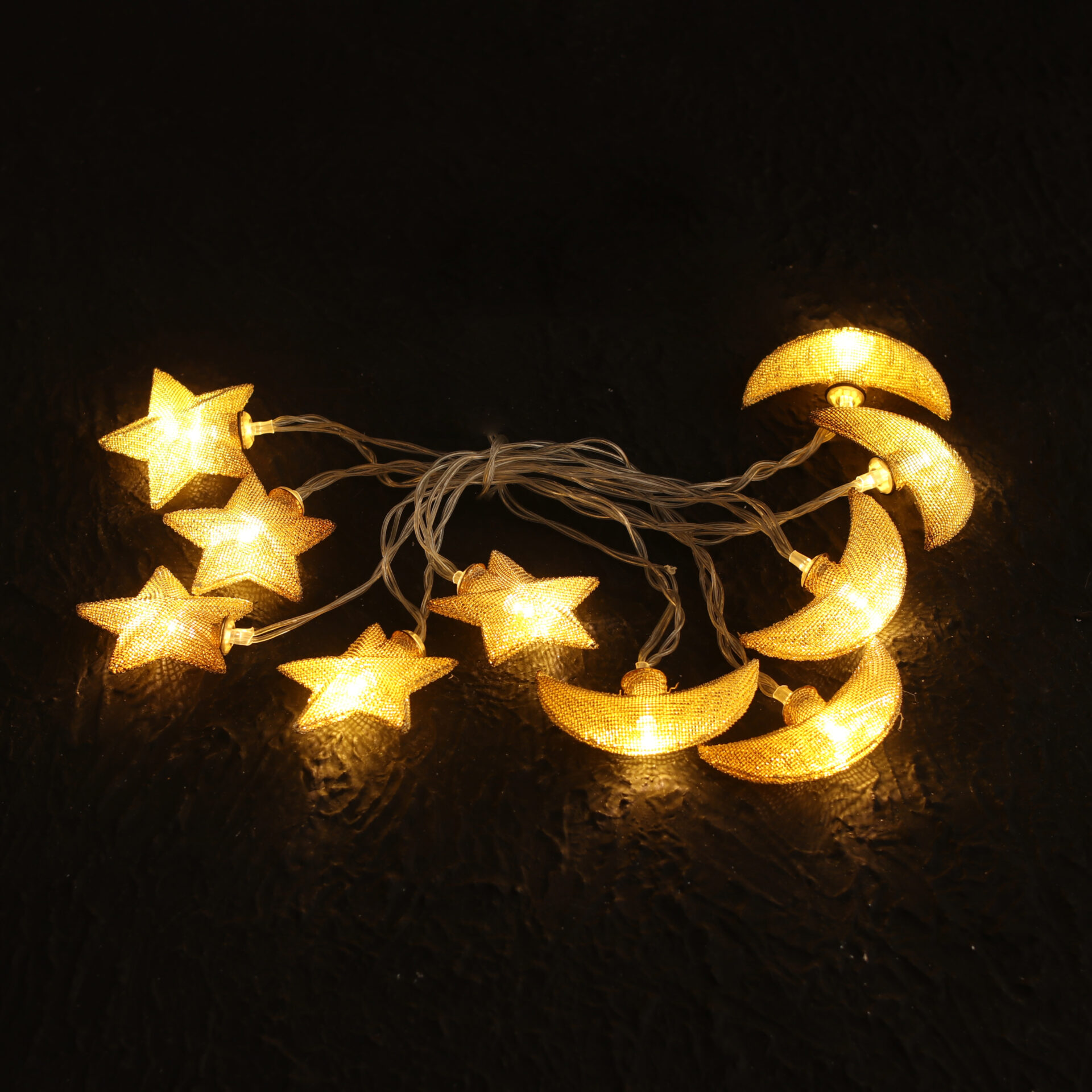 Cadena decorativa con luces con forma de lunas y estrellas doradas.