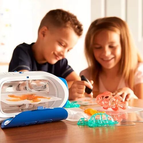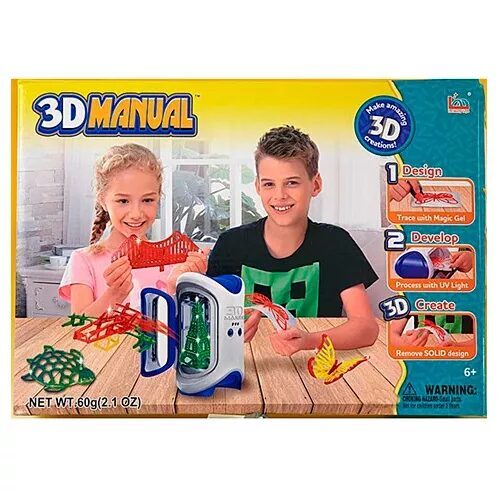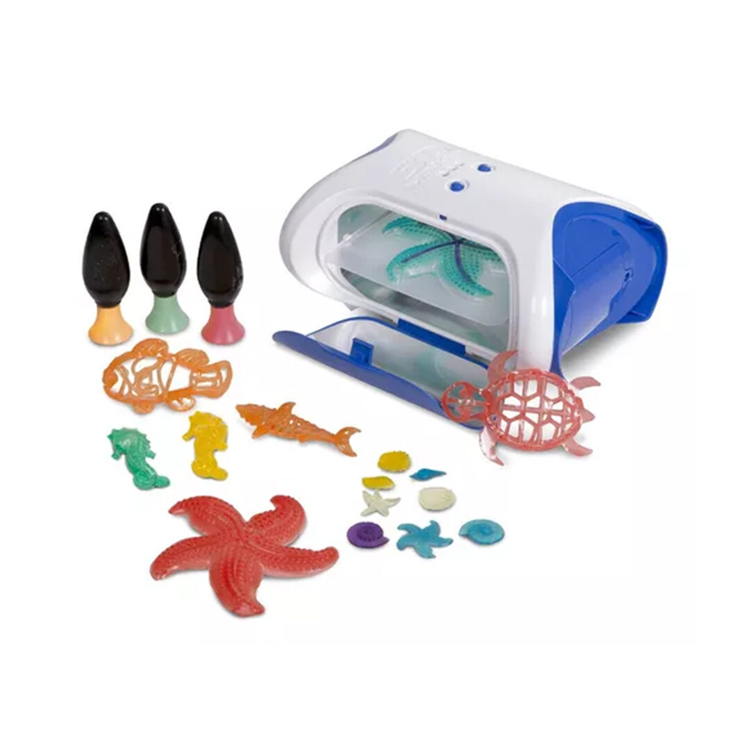 El 3D Maker es un juguete revolucionario y totalmente funcional que, con tubos especiales de gel y luz ultravioleta, permite a tus hijos crear objetos tridimensionales.