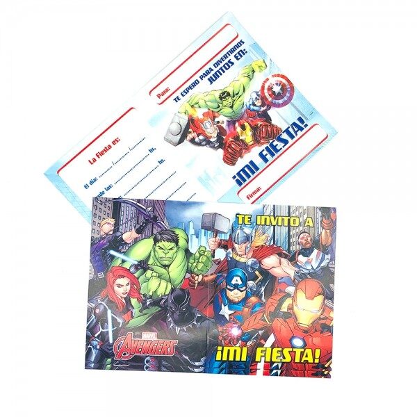 Invitaciones de papel tipo díptico doble faz de la línea de personajes de The Avengers (Los Vengadores).