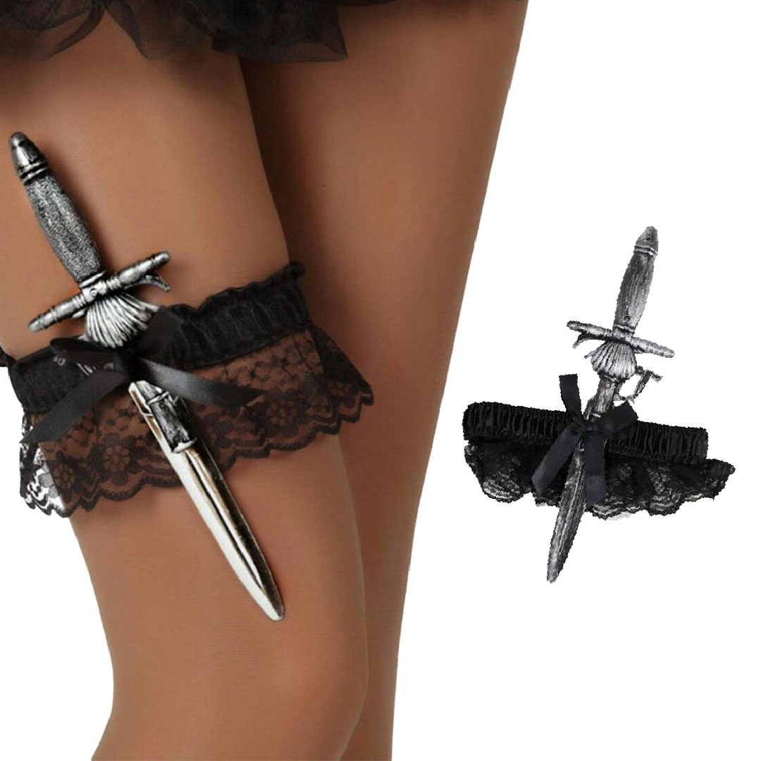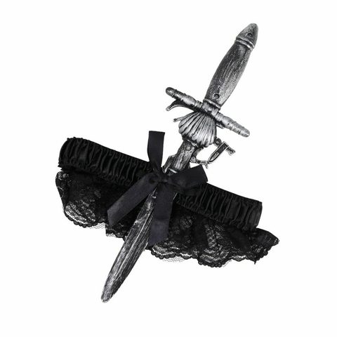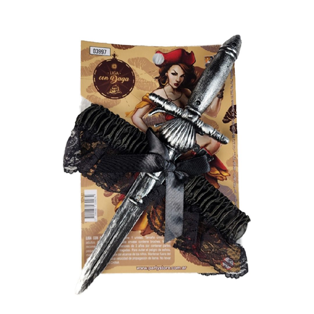 Se trata de una liga elástica decorativa que se coloca en la pierna, acompañada por una pequeña daga plástica como accesorio. No es un arma real, sino un elemento de cotillón y fantasía, pensado para sumar humor, picardía y un aire diferente al vestuario.