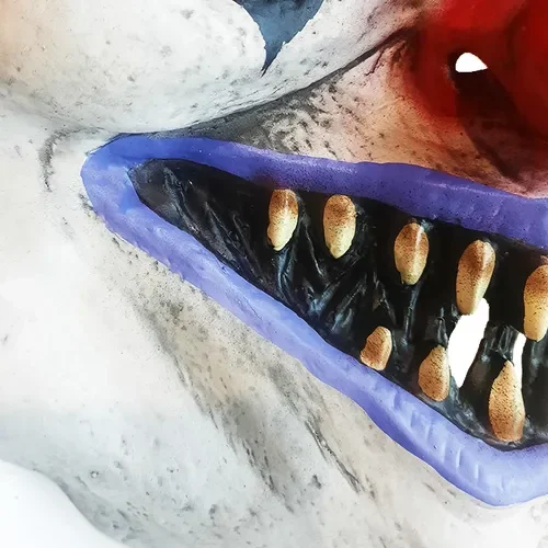 - Diseño exagerado y expresivo: Boca gigante con sonrisa escalofriante, ojos abiertos y cejas marcadas.