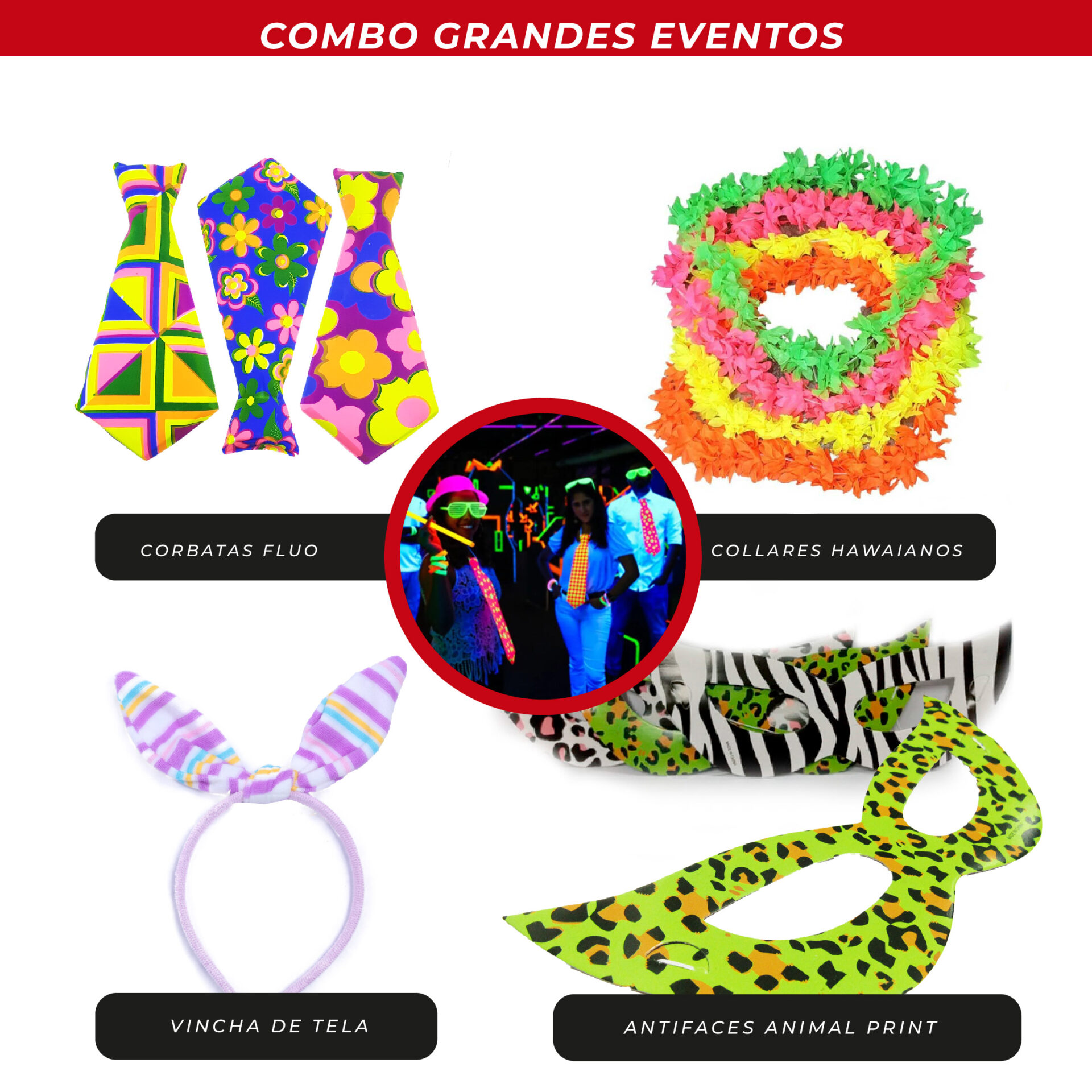 Porque sabés que lo único peor que una pista vacía es una pista aburrida. Con este pack, el color, el brillo y la risa están asegurados. Es un recurso infalible para activar la fiesta y lograr que todos se suelten, bailen y saquen fotos inolvidables.