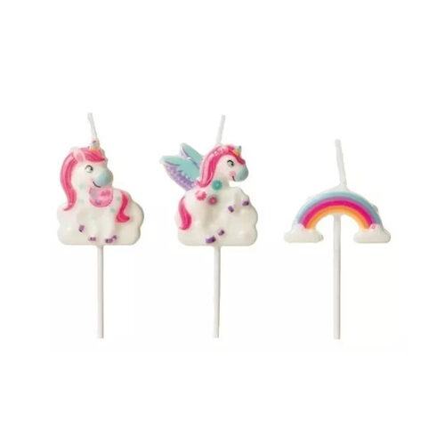 Cada pack incluye un conjunto de 5 velas de diferentes especies de unicornios, perfectas para decorar un pastel de cumpleaños temático.