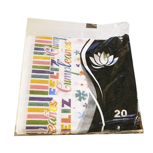 Son servilletas desechables fabricadas en papel tissue de varias capas, decoradas con mensajes y diseños de “Feliz Cumpleaños”. Vienen en packs de 20 unidades y están pensadas para adaptarse a todo tipo de cumpleaños, ya sea de niños, adolescentes o adultos.