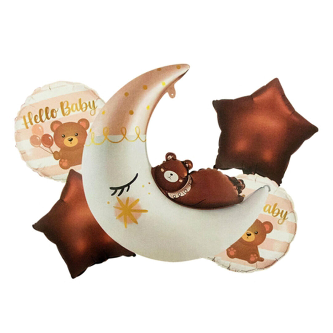 - Incluye 5 globos metalizados: 1 globo luna con oso de 76 x 86 cm, 2 globos redondos de 18″ hello baby, 2 globos de estrellas 18″