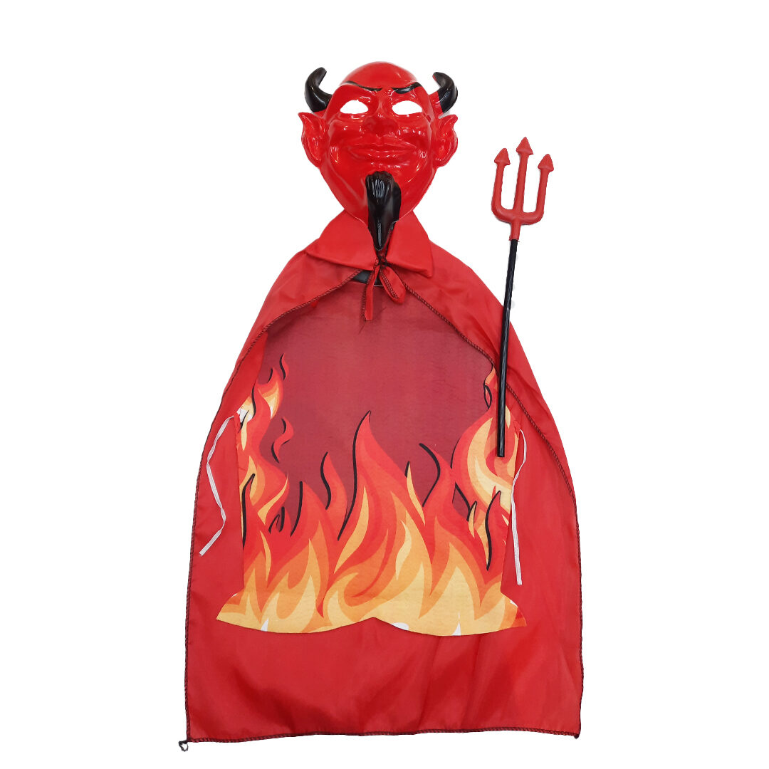 - Accesorios fundamentales: Cada pieza del set es fundamental para recrear el terrorífico look de un diablo. Incluye una máscara PVC, una capa roja, un tridente plástico y una pechera.