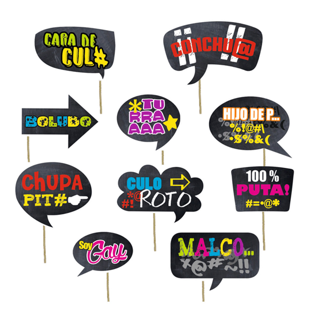 Pack de 10 unidades de palitos con frases divertidas y diseños coloridos sobre malas palabras.