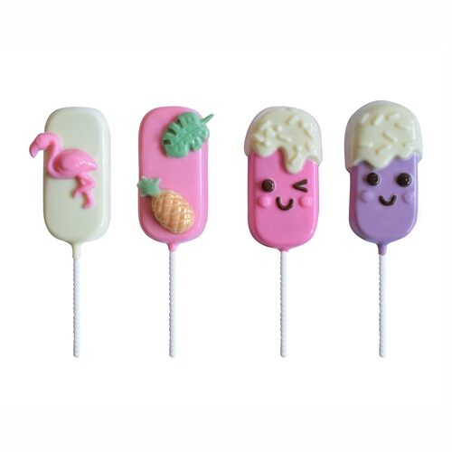 - Set compuesto de 2 moldes placas plásticos, para realizar 4 paletas rellenas con cobertura de chocolate, dos con caritas «IceCream» y dos lisas con accesorios motivo «tropical».