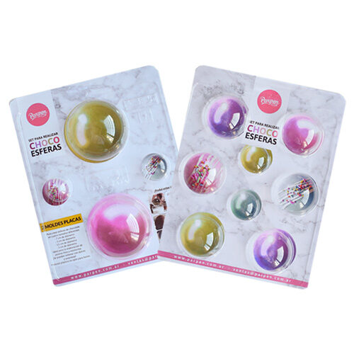 - El set está compuesto de 2 moldes placas plásticos, especiales para crear esferas de chocolate en cuatro tamaños diferentes: 7 cm de diámetro, 5 cm de diámetro, 3,5 cm de diámetro y 3 cm de diametro.