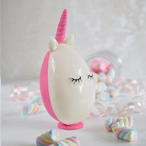 Cada huenicornio tiene detalles delicados y encantadores: orejitas, cuerno, pestañas y una carita feliz. Además, podés decorar el huevito a tu gusto con golosinas, mini sorpresas o simplemente usarlo como parte de la deco.