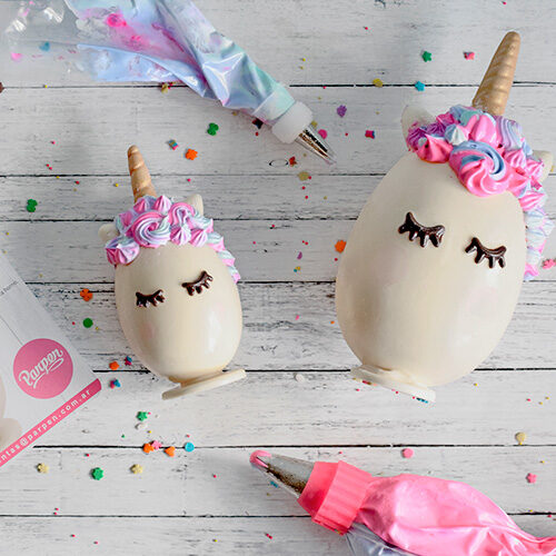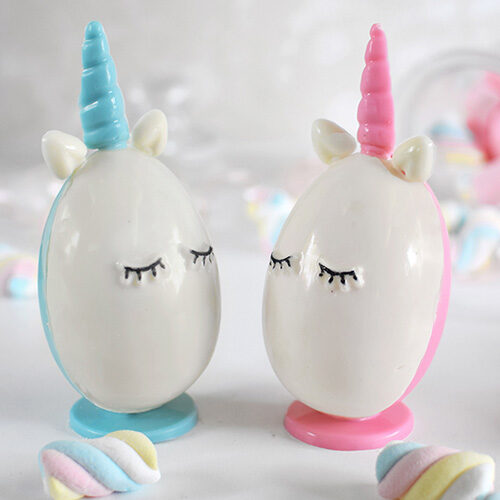 Cada huenicornio tiene detalles delicados y encantadores: orejitas, cuerno, pestañas y una carita feliz. Además, podés decorar el huevito a tu gusto con golosinas, mini sorpresas o simplemente usarlo como parte de la deco.