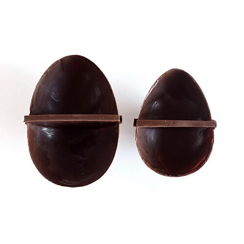 2 Moldes Placas para crear huevos de chocolate con divisor, especiales para rellenar con dos gustos de crema o pasta diferentes.