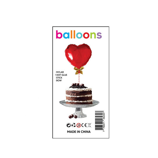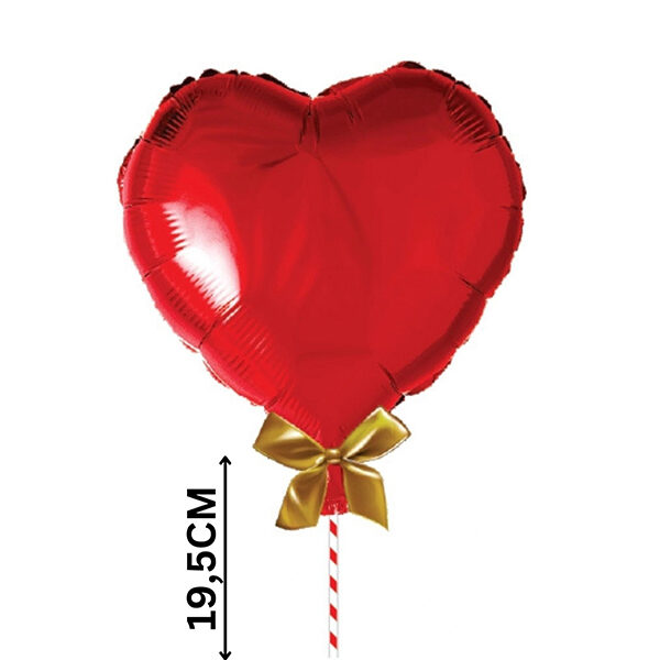 Cada paquete contiene un globo de corazón rojo de 25 cm. aprox, 2 gotas de pegamento, 1 moño, 1 palito soporte globo.