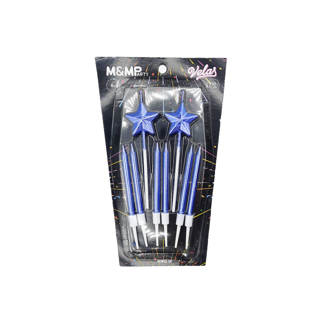 Pack de 6 velas finas metalizadas de color azul y 2 velas en forma de estrella con incrustador para colocar directamente en tu torta!